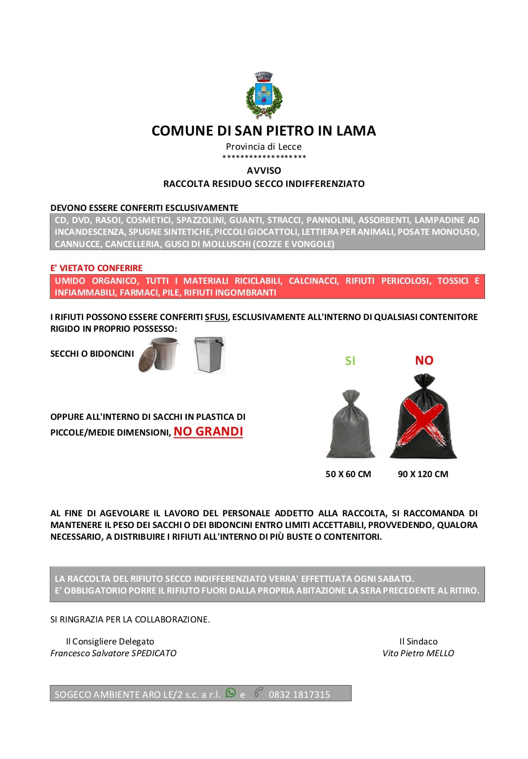L'Amministrazione Comunale al fine di fornire una dettagliata informazione ha intanto diramato un nuovo volantino proprio sul corretto conferimento del rifiuto secco indifferenziato.
