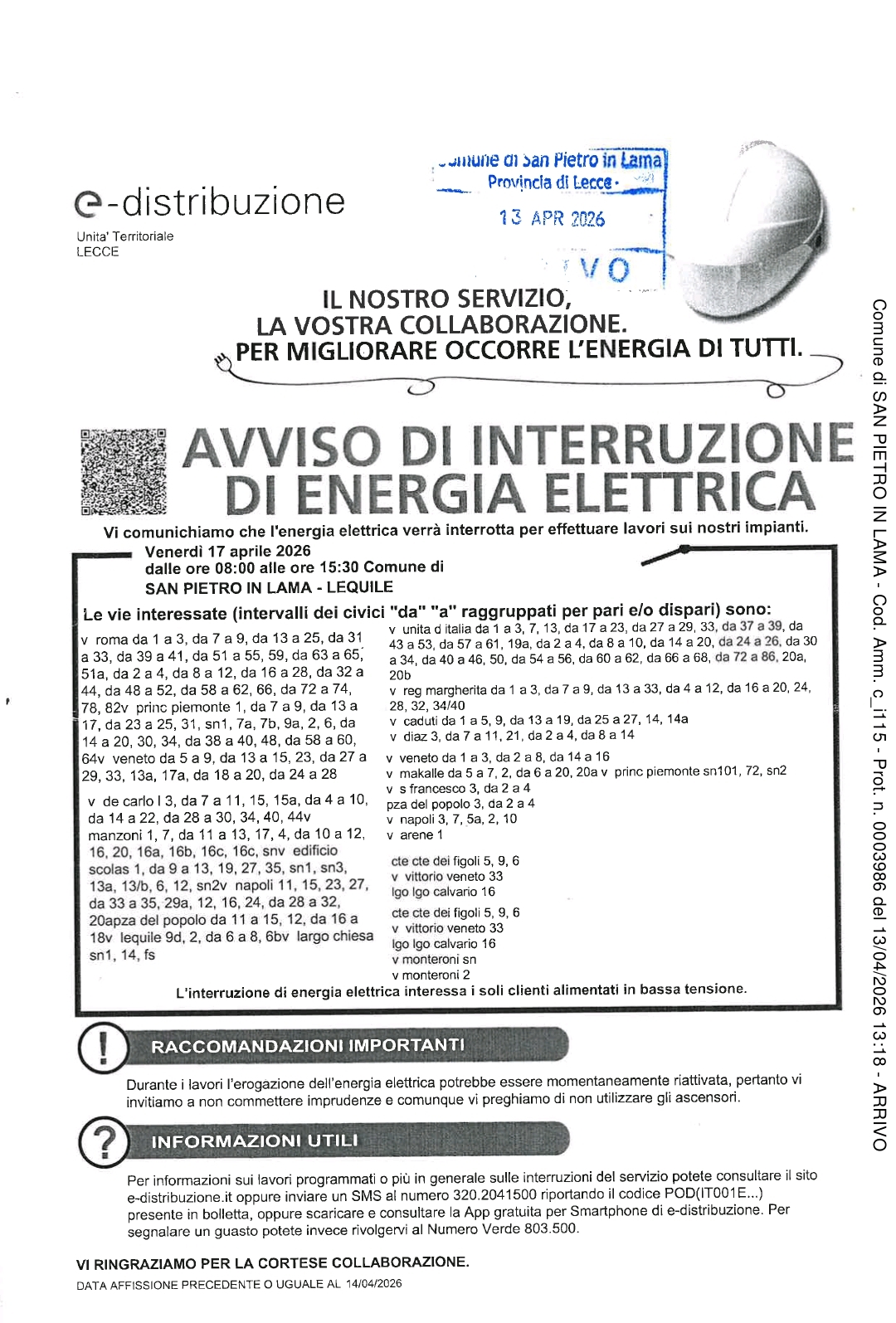 La società E-distribuzione ha comunicato che Venerdì 17 Aprile 2026 dalle ore 8:30 alle ore 15:30 sulle strade nell’elenco allegato sarà interrotta la distribuzione di energia elettrica per eseguire lavori sugli impianti.