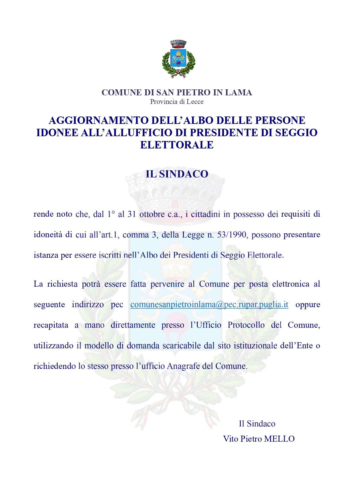 A cura di Questa pagina è gestita da Settore 1 - Amministrazione Generale Via Milano, SNC, 73010 San Pietro in Lama LE