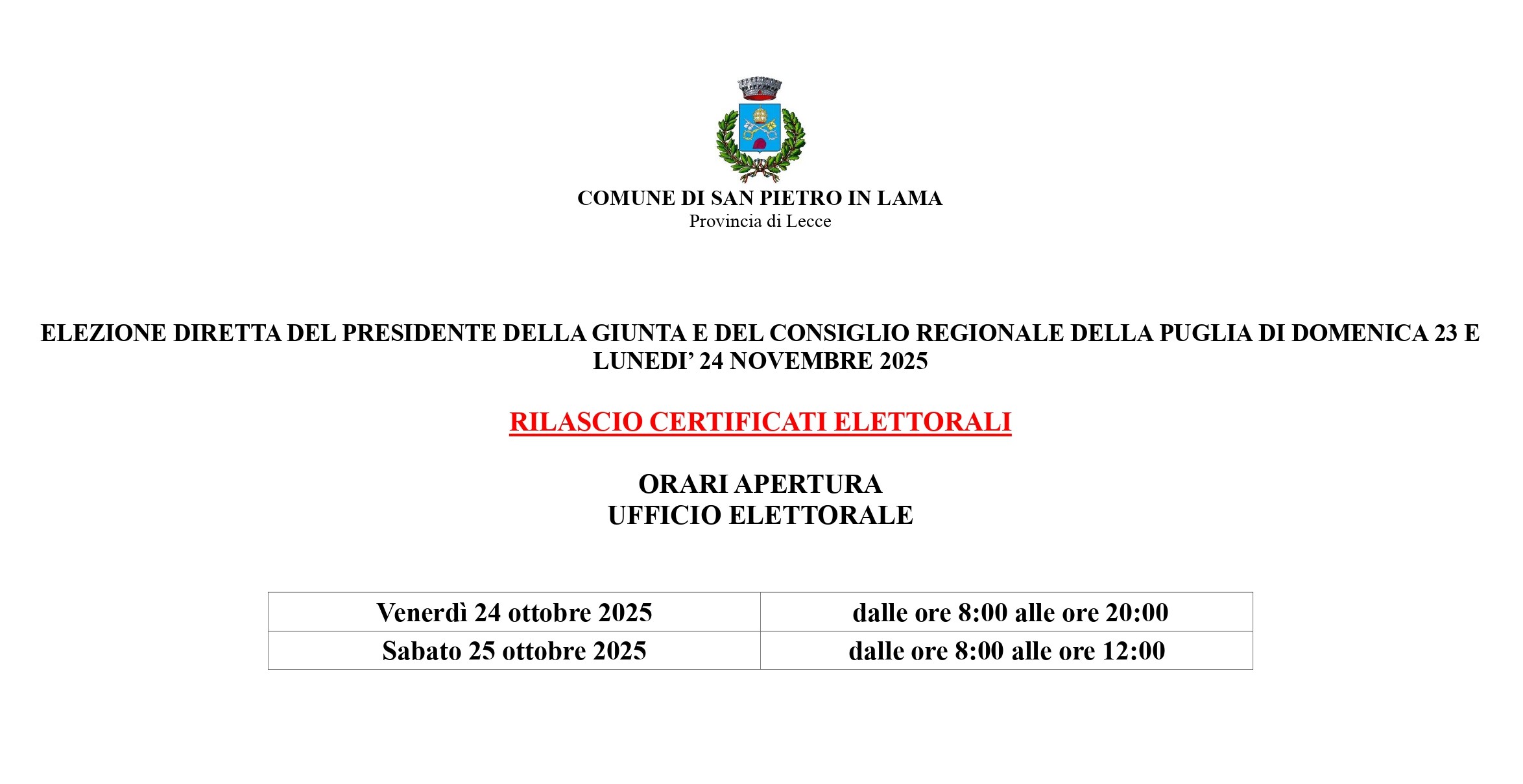 Apertura straordinaria Ufficio Elettorale del 24 e 25 ottobre 2025